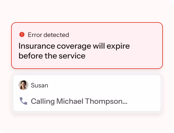 Susan starts by checking if insurance information is present in the patient's records, including member ID & provider details. If any crucial information is missing, Susan automatically notifies the intake team.